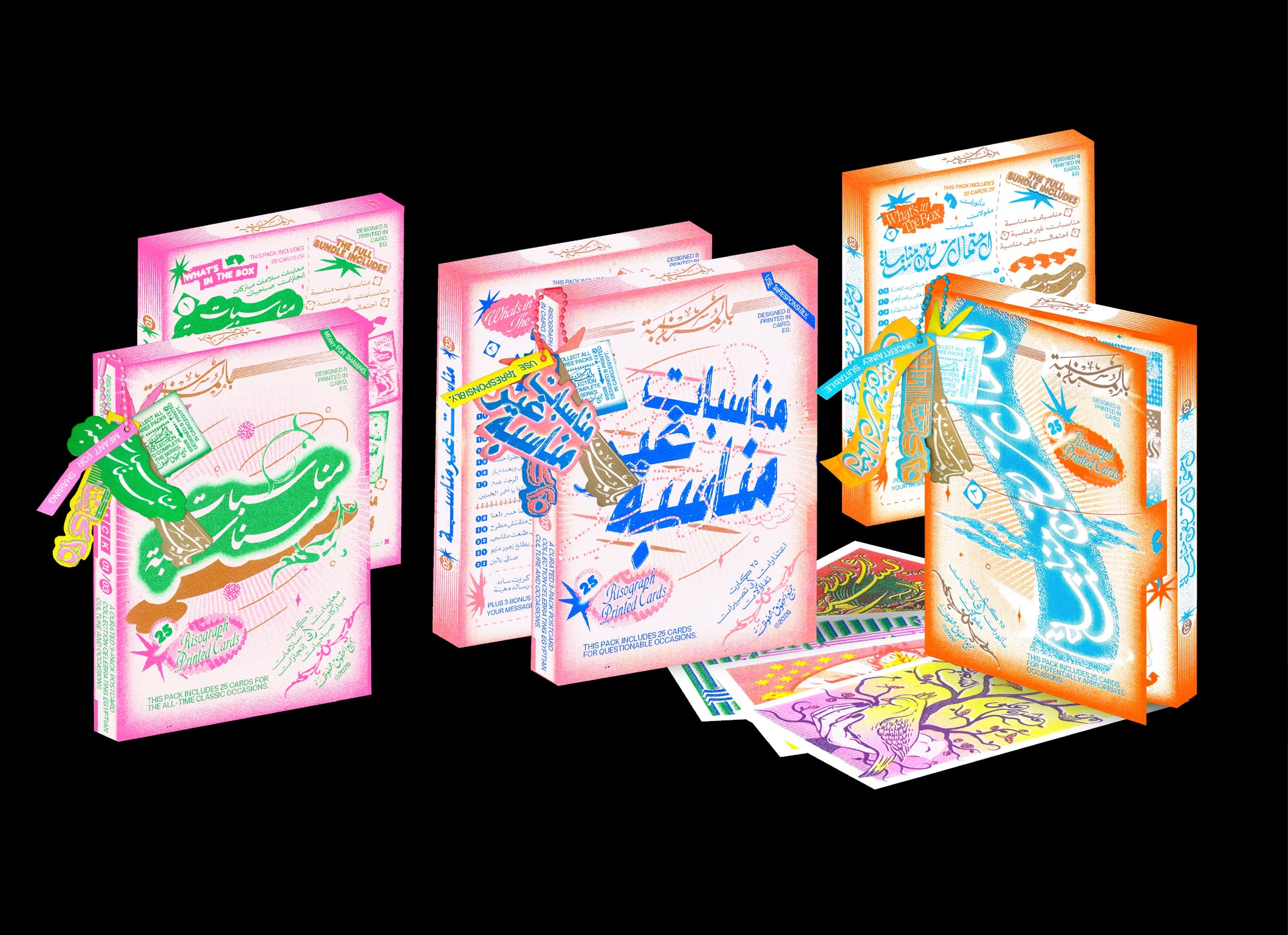 The multi-purpose pack: a collection of 25 Riso-printed cards featuring Egyptian sayings and local expressions that could fit into multiple occasions.