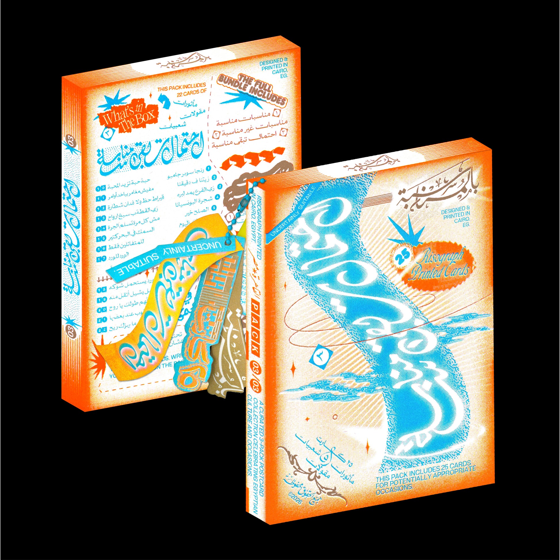 The multi-purpose pack: a collection of 25 Riso-printed cards featuring Egyptian sayings and local expressions that could fit into multiple occasions.