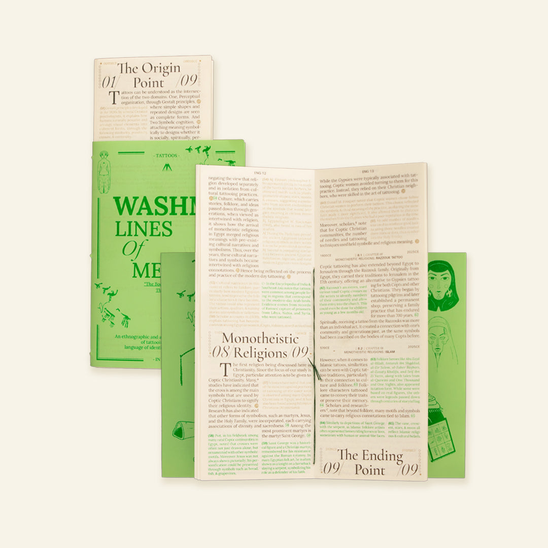 This zine offers an ethnographic and anthropological look at tattooing as a language of identity and self-expression. It explores how tattoos have always been more than cultural or religious symbols and how they became a form of freedom rooted in meaning, religion, symbolism, and culture. Focusing on Egypt, it shows how tattoos once documented life and context, turning the body into the medium that held the narrative of existence.