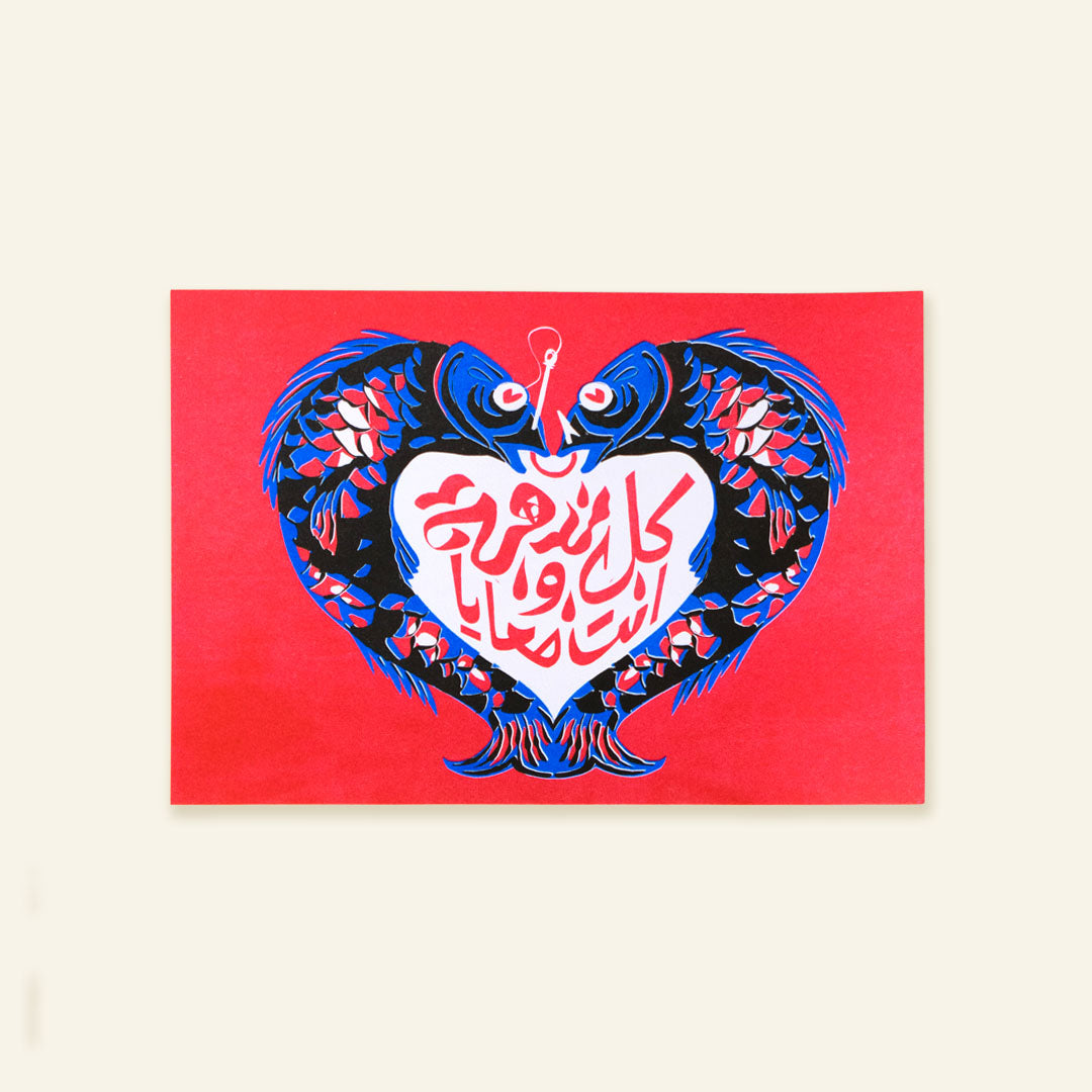 A romantic twist on a classic Egyptian legend. While the myth of El Naddaha is usually about a dangerous, lonely call, this design turns it into a promise of companionship. The artwork features two stylized Nile fish mirrored to form a heart. Inside, the Arabic calligraphy reads: "كل ندهة وانت معايا" (With every call, you are with me).