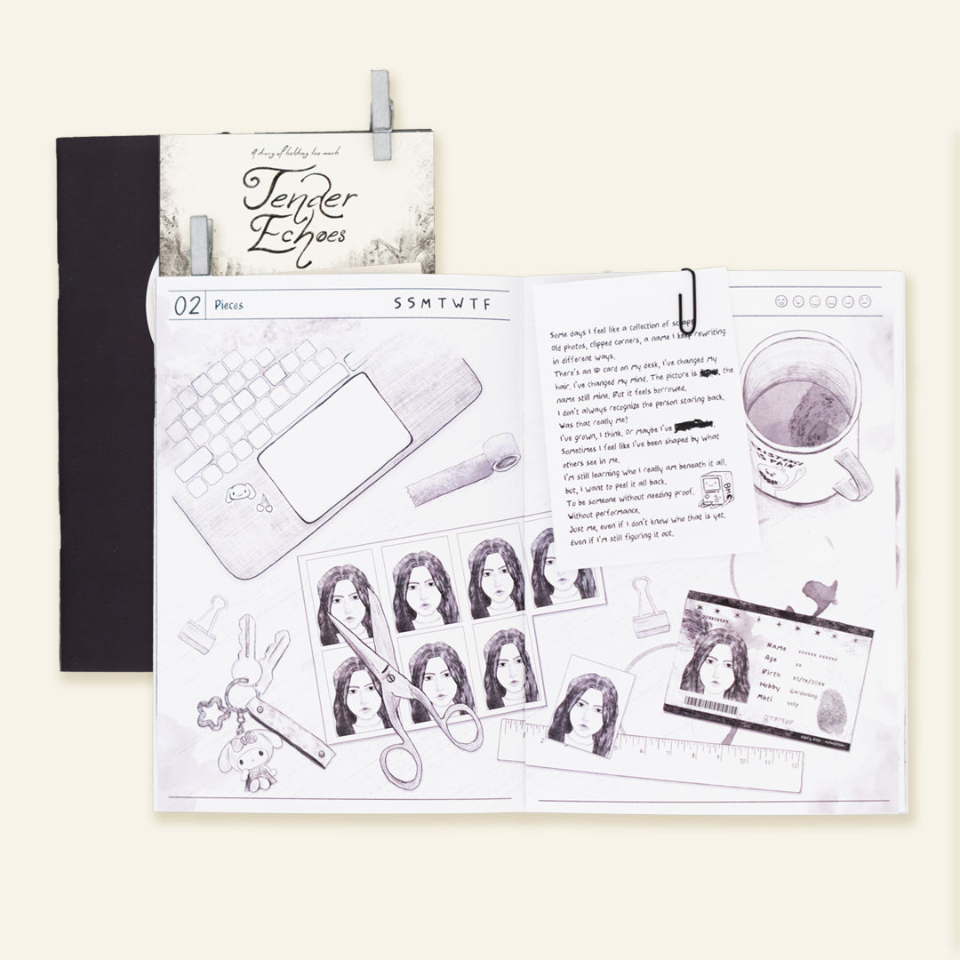 Tender Echoes is an illustrated collection of thoughts, memories, and fleeting emotions that unfolds over seven days. Each day captures deeply personal reflections around themes of memory, identity, family, platonic love, and vulnerability, with a poetic, soft tone.